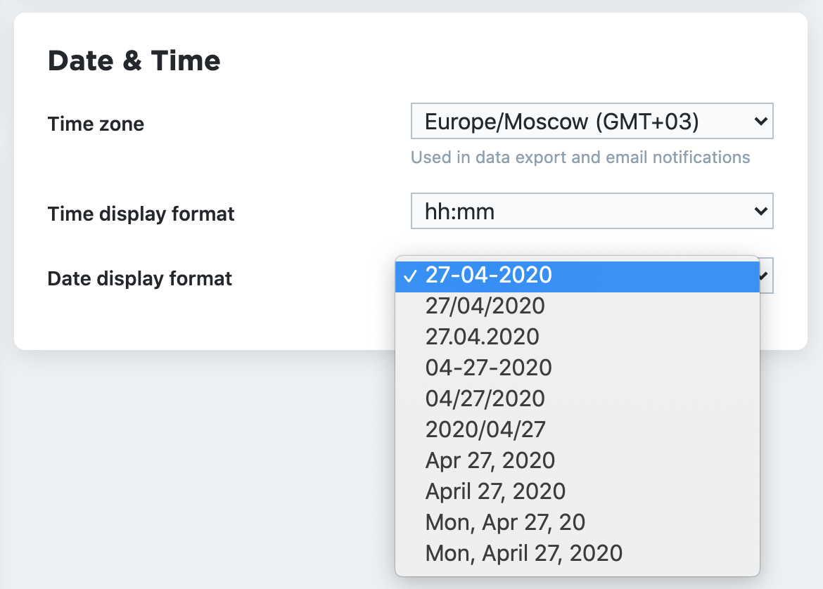 You can set up the time zone, time display format and date display format for your store. These settings will be used in data export and email notifications – thus helping you and your customers keep track of the events better.
