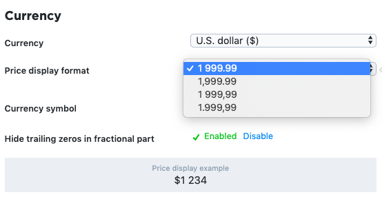 - Choose the display format for the prices in this currency (it will not affect input fields for prices in your store's admin):
