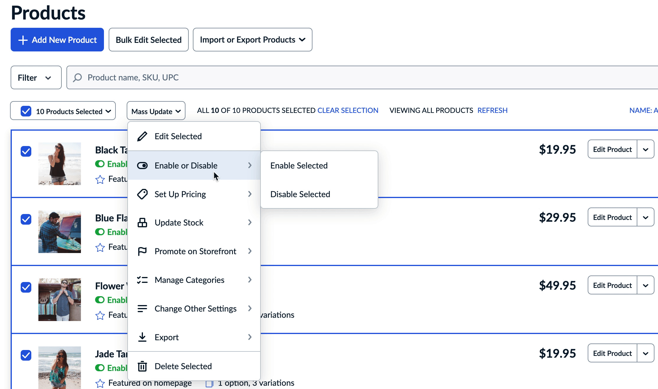 The Mass Update tool allows you to instantly update products along with their variations by applying the same change to all the selected items. For example, if you want to temporarily disable seasonable items or you want to raise prices by 5% to cover your expenses.